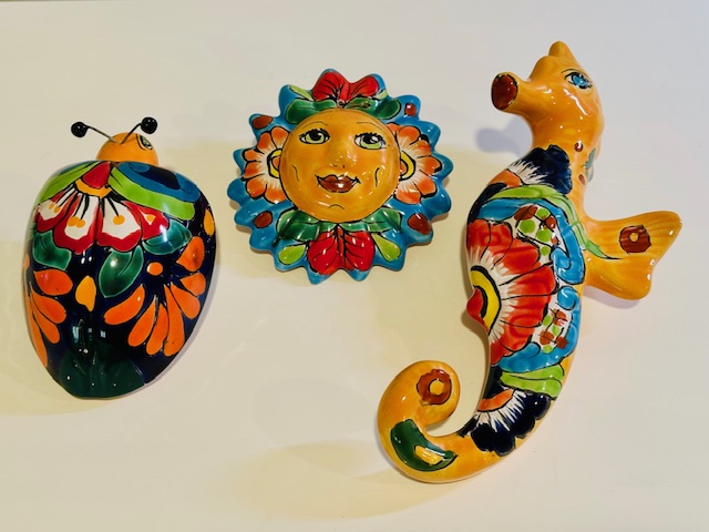 素材は陶器です。メキシコを感じるかわいい壁飾りです。太陽、タツノオトシゴ、てんとう虫の3点セットです。ひびや欠けは無く、綺麗な状態です。3点セットでの販売です。