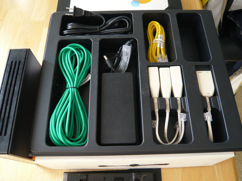 付属品:LANケーブル、電話線、ACアダプター、説明書