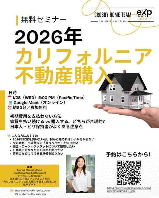 01/28/26(水) 無料セミナー 2026年カリフォルニア不動産購入